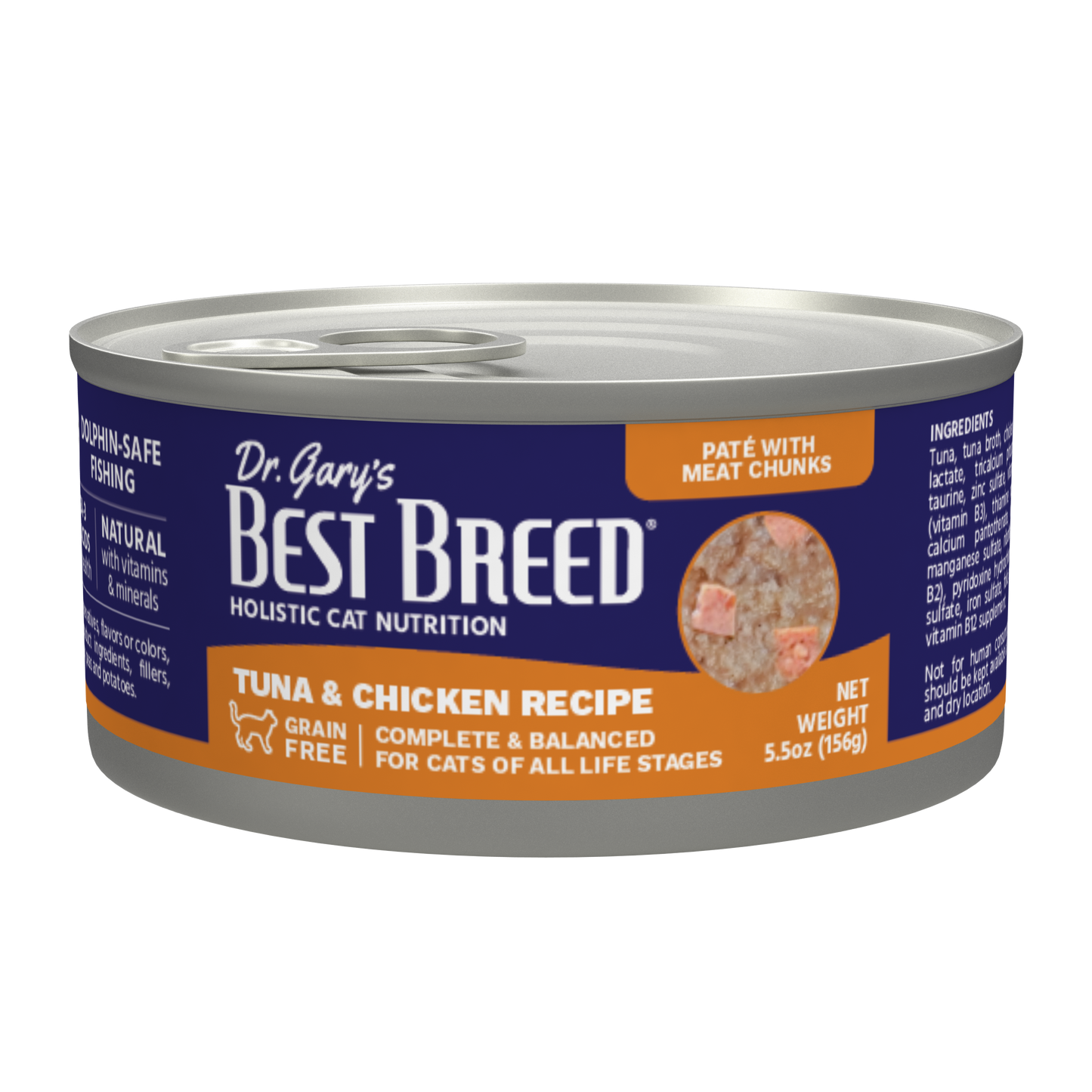 A healthful, meat-rich Tuna and Chicken canned food.  Complete and balanced for cats of all life stages.