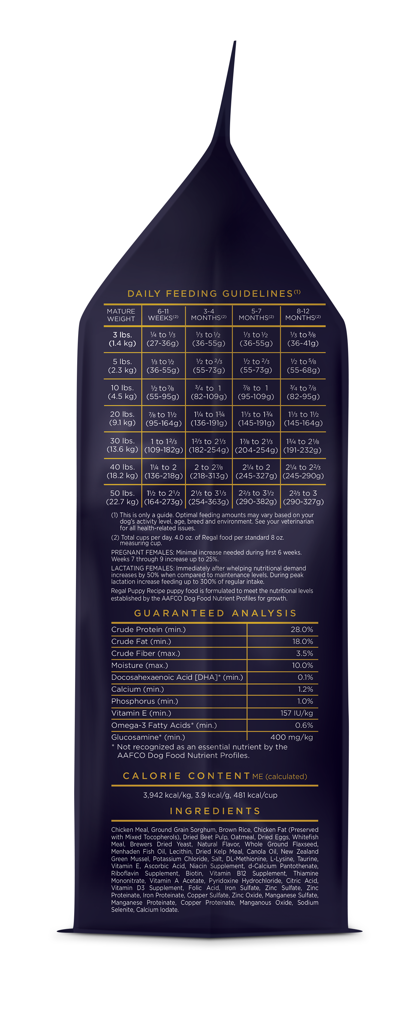 Regal Puppy Recipe puppy food is formulated to meet the nutritional levels established by the AAFCO Dog Food Nutrient Profiles for growth.